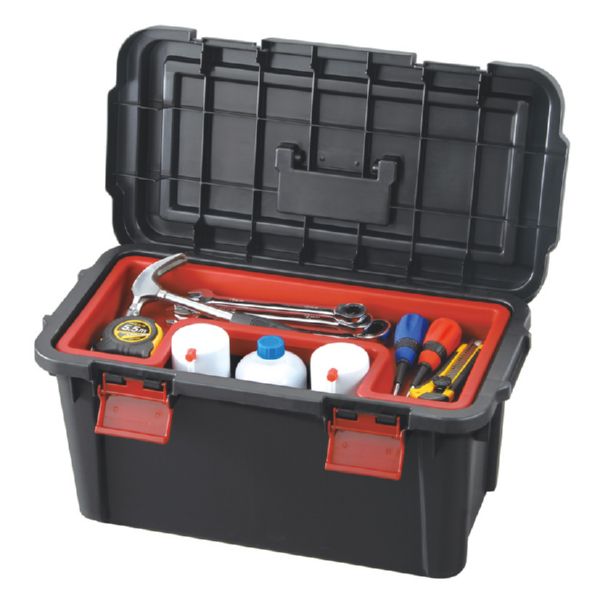 Estructura polipropileno reforzado. Cierres ABS de gram resistencia. Bandeja interior con hueco para colocar verticalmente botes de spray o tubos. Cajas apilables entre sí. Color negro/rojo acabado mate. Fabricadas en Japón. 56x29x29 cm.