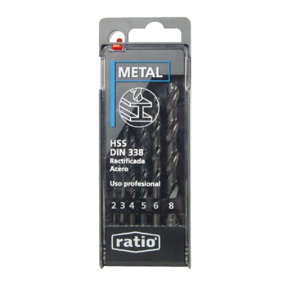 Acero rápido (HSS) DIN 338N, geometría corte rectificada. Calidad profesional. Estuche plástico 6 brocas. Ø 2, 3, 4, 5, 6, 8 mm.