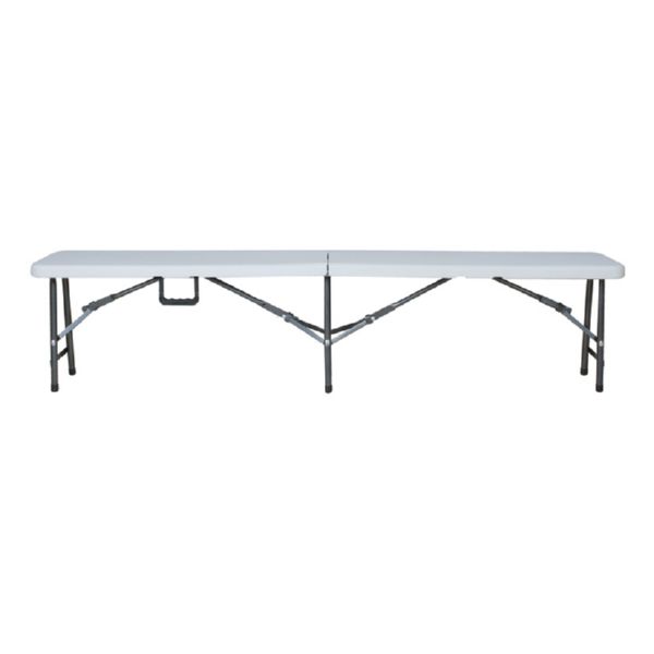 Tablero de polietileno blanco de alta densidad. Estructura en acero. Asa de transporte. Sistema de plegado fácil. Banco 183x30xh.44 cm.