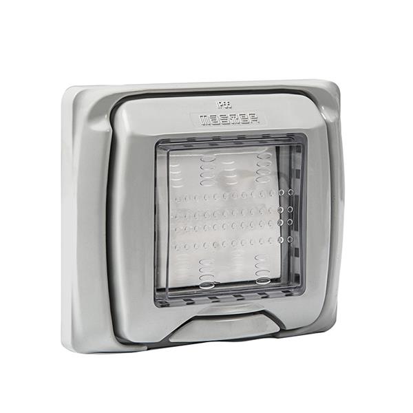 La cubierta transparente con protección IP55 garantiza un sellado eficaz en exteriores,. ofreciendo un diseño versátil que se adapta a todo tipo de entornos. Conmutador.