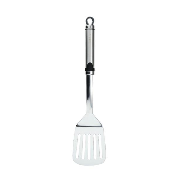 Acero inox de alta resistencia. Mango ovalado con colgador. Aptos para lavavajillas. Espátula ranurada inox. 35 cm.