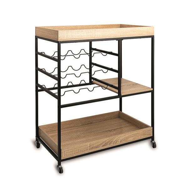 Acero lacado negro y madera MDF. Alta resistencia con recubrimiento melamínico y estructura de acero pintado. Dispone de práctico botellero con capacidad para 12 botellas, 2 bandejas y 1 balda con una gran capacidad de almacenaje. 4 ruedas. 75x40xh. 91,5 cm.