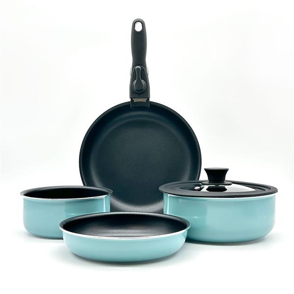 Aluminio alta calidad. Con mango extraíble de color azul cielo. Apta todo tipo de cocinas. Puede utilizarse en horno y freidoras de aire. Incluye tapa y utensilios de cocina. Incluye 2 cacerolas, 2 sartenes, tapa multitamaño, mango removible y pack de espátula y cucharón. 2 cacerolas ø 16 y 20 cm. 2 sartenes ø 20 y 24 cm.
