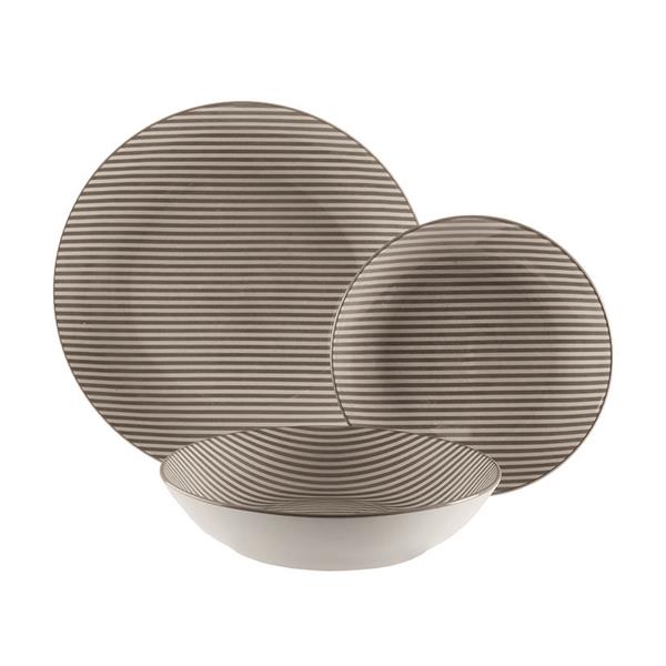 Vajilla porcelana 18 pzas. Caja litografiada. Apto para lavavajillas y microondas. 6 platos llanos de 26,5 cm, 6 platos hondos de 20 cm y 6 platos de postre de 19 cm.