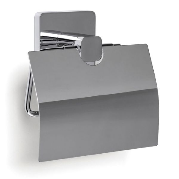 Zamak cromado. Sistema fijación 3M apto para superficies lisas no porosas. Inoxidable. 10 años de garantía. Portarrollo con tapa. 125x50xh.125 mm.