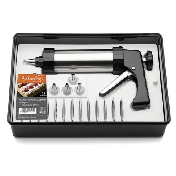 Cuerpo metálico. Estuche 21 accesorios. Pistola 250 ml. 8 boquillas 13 disco para galletas