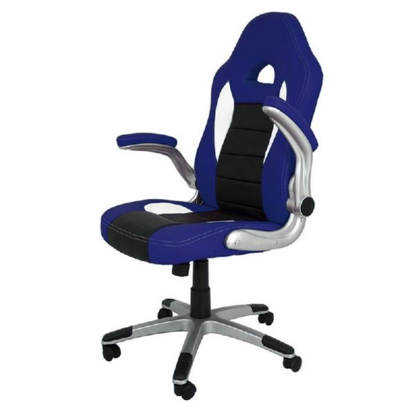 Asiento símil piel. Base de nilón lacada plata. Color azul y negro. Con brazos.