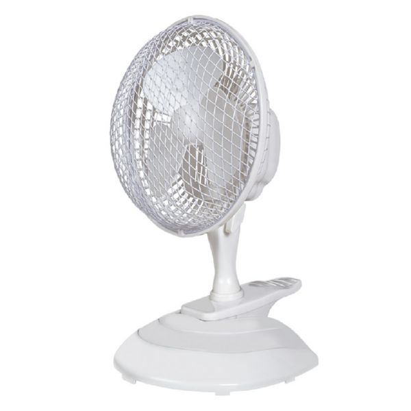 2 velocidades. Cabezal orientable. Pinza para sujeción en mesas, tableros, etc. Potencia: 15 W. Cabezal: ø 19 cm. Dimensiones: base ø 19xh.33 cm. Caudal máx. aire: 11,08 m³/min.
