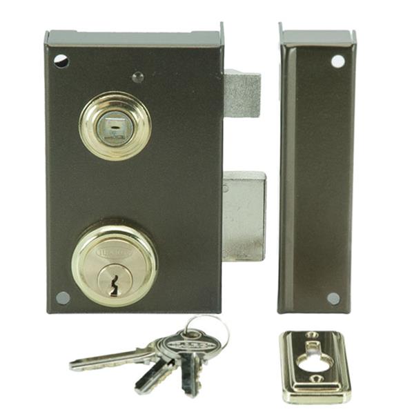 Con cilindro y palanca accionada con llave por ambos lados y picaporte accionado con manilla desde el interior. Bombillo perfil. 70 mm. Entrada 43 mm. Izquierda.