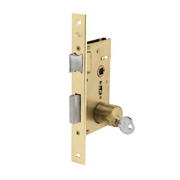 Golpe y llave. Cilindro de vástagos redondos, reversible, frentre latonado. Entrada 40 mm.