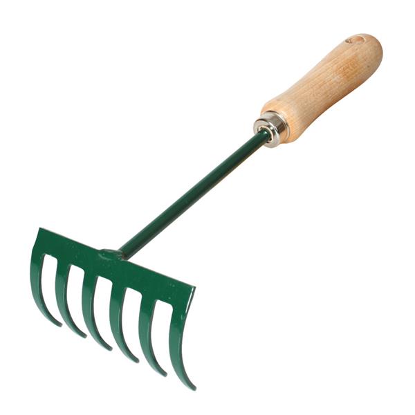 Acero pintado epoxi. Mango madera barnizada fijado con virola metálica. Rastrillo 6 dientes. 300 x 110 mm.