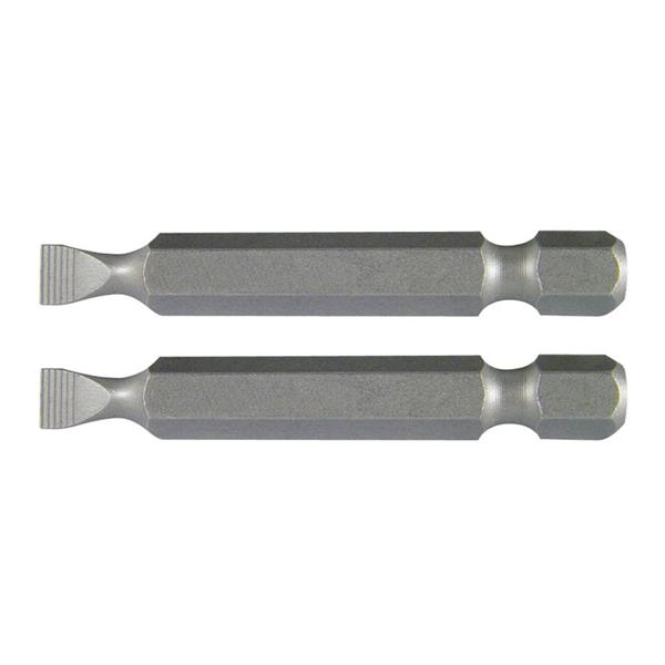 Puntas 50 mm. Hexágono 6,35 mm. Acero cromo-vanadio S2. Dureza 59 - 61 HRc. DIN 6126. Blister 2 puntas. Plana 1,0 x 5,5 mm